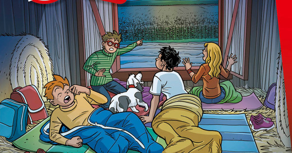 Die Illustration zeigt die vier Freunde beim nächtlichen Beobachten aus der Scheune heraus – mit Blick auf das leuchtende Feld. Die Szene transportiert sofort Abenteuer, Neugier und das UFO-Thema und passt sehr gut zur Reihe. Farbgebung und Stil bleiben der TKKG-Junior-Optik treu und wirken freundlich und dynamisch.